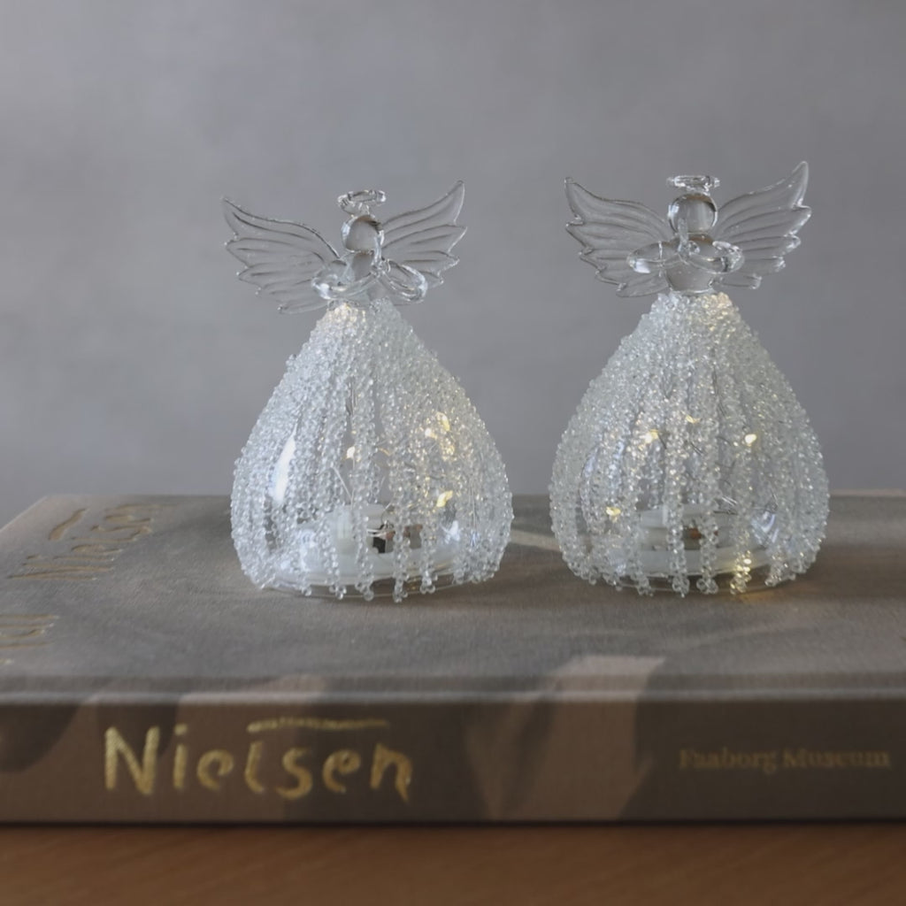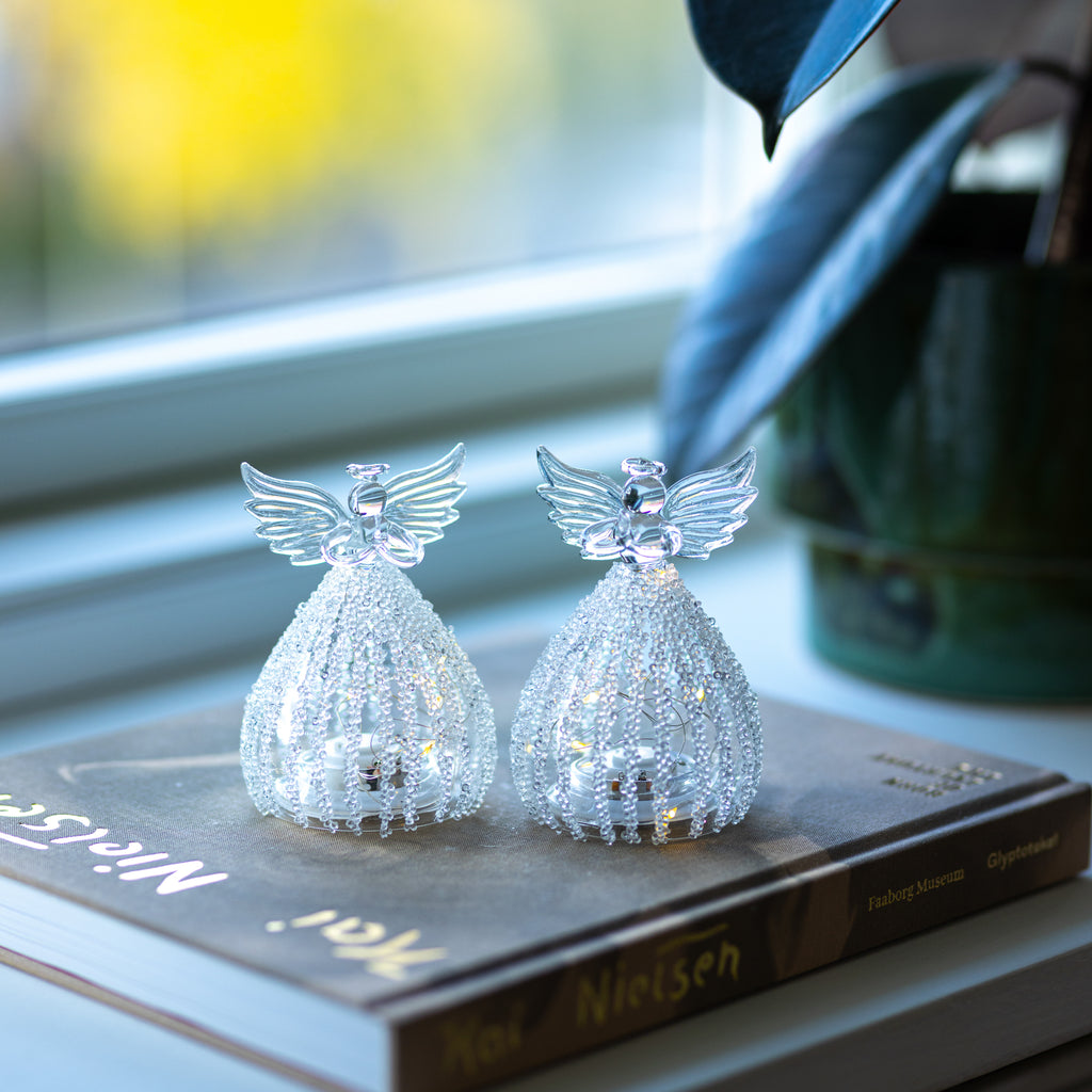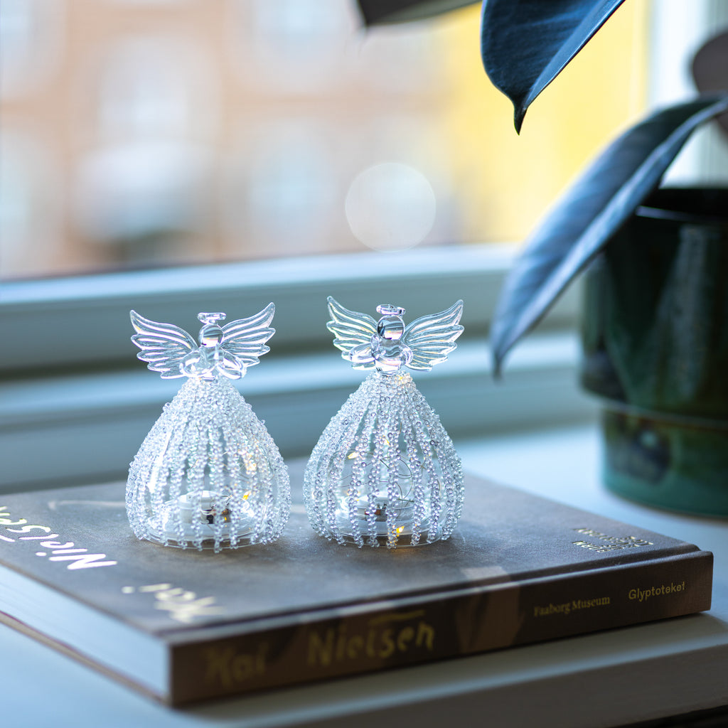 Kaksi söpöä, pulleaa enkeliä lasissa, jossa on LED-valot. Enkelien vartalot ovat mattavalkoisia, mikä saa ne hehkumaan pehmeästi. Enkelit on maalattu käsin, minkä vuoksi kuvioinnissa ja valossa voi olla pieniä vaihteluita. Koristele kotisi näillä jouluenkeleillä, jotka luovat kodikasta joulutunnelmaa.
