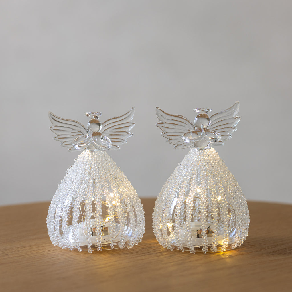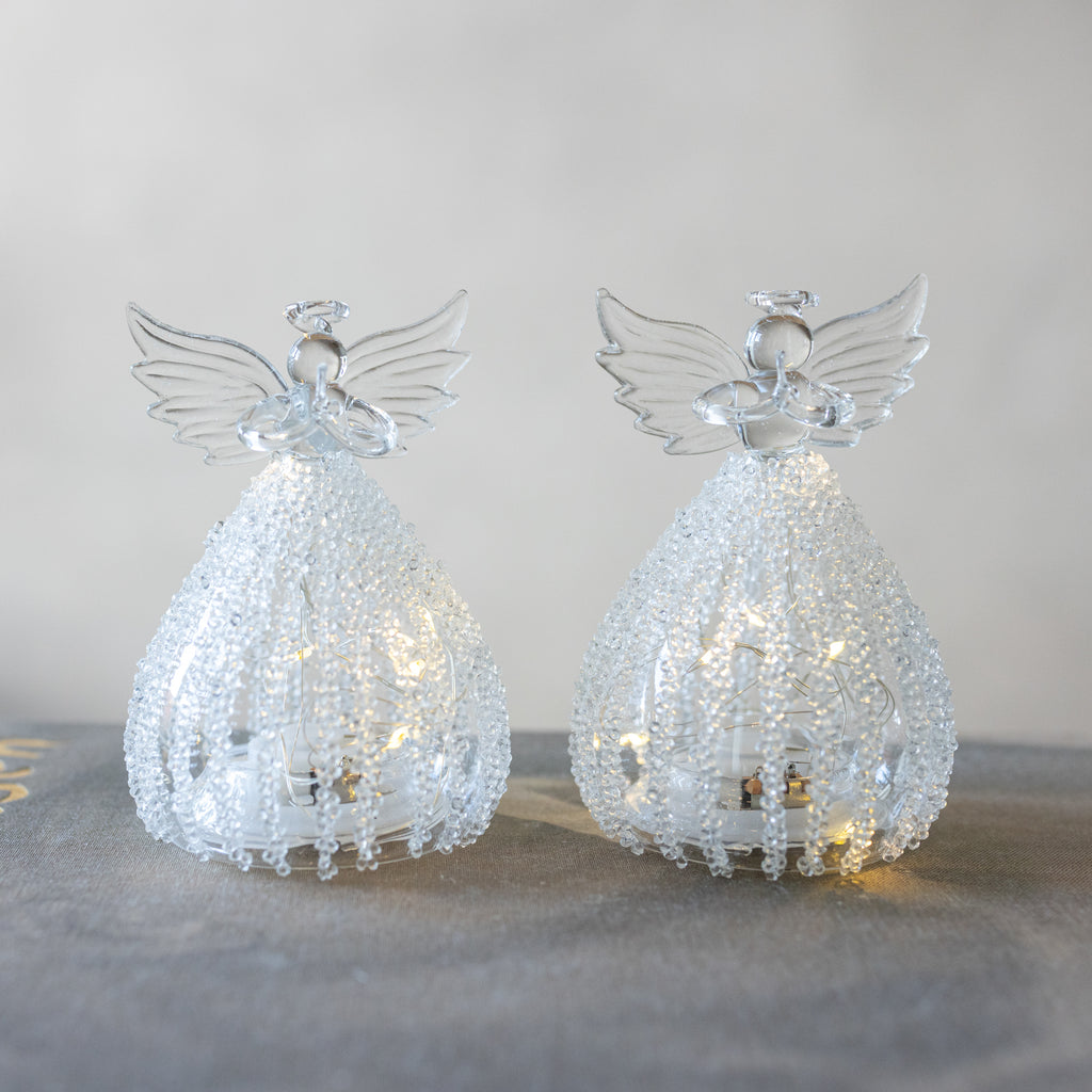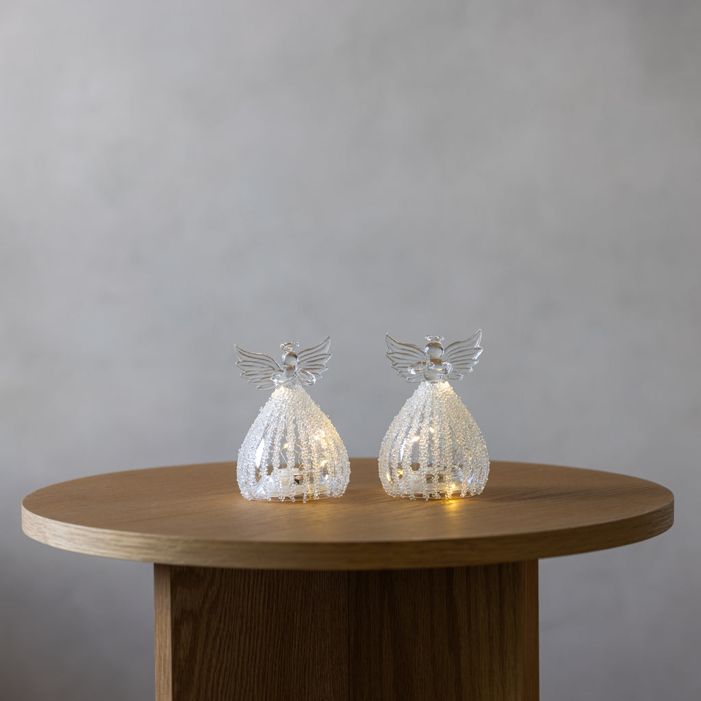 Kaksi söpöä, pulleaa enkeliä lasissa, jossa on LED-valot. Enkelien vartalot ovat mattavalkoisia, mikä saa ne hehkumaan pehmeästi. Enkelit on maalattu käsin, minkä vuoksi kuvioinnissa ja valossa voi olla pieniä vaihteluita. Koristele kotisi näillä jouluenkeleillä, jotka luovat kodikasta joulutunnelmaa.